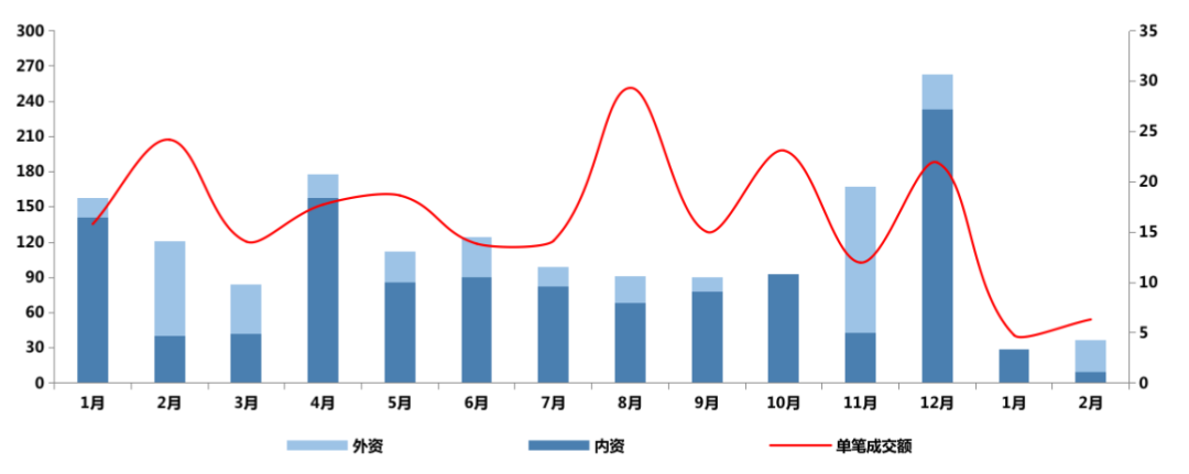 克而瑞CAIC AI監測顯示,2021年1-2月,中國內地大宗物業共成交12筆,交易總額約 67億元,同比降幅76.3%;平均單筆成交額約5.6億元,同比下降69.9%,降幅顯著。