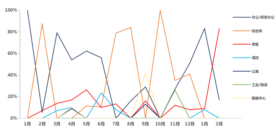 一線城市新興商務區的優質寫字樓以及運營表現優異、回報穩定的商業資產受到資本青睞。1月,辦公/研發辦公業態成交占比超80%,為絕對主力;2月,受上海商業成交占比提升影響,一線城市整體商業占比大幅提升,為近一年來最高值。