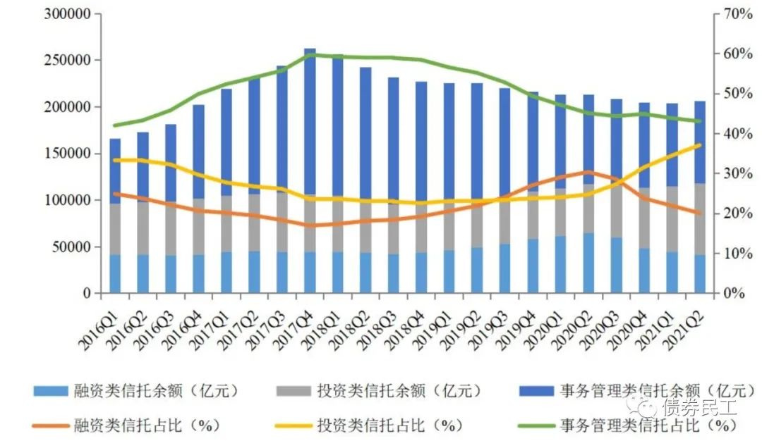 信托資產按照功能分類來看,融資類信托的余額和占比在2020年2季度末達到最高峰,此后持續呈現下降趨勢。2021年2季度末,融資類信托余額為4.13萬億元,相比2021年1季度末的4.45萬億下降了0.32萬億元,降幅為7.19%;相比2020年2季度末的6.45萬億下降了2.32萬億元,降幅高達35.97%!這個降幅不可謂不高,在實踐中大大降低了信托產品的融資功能。