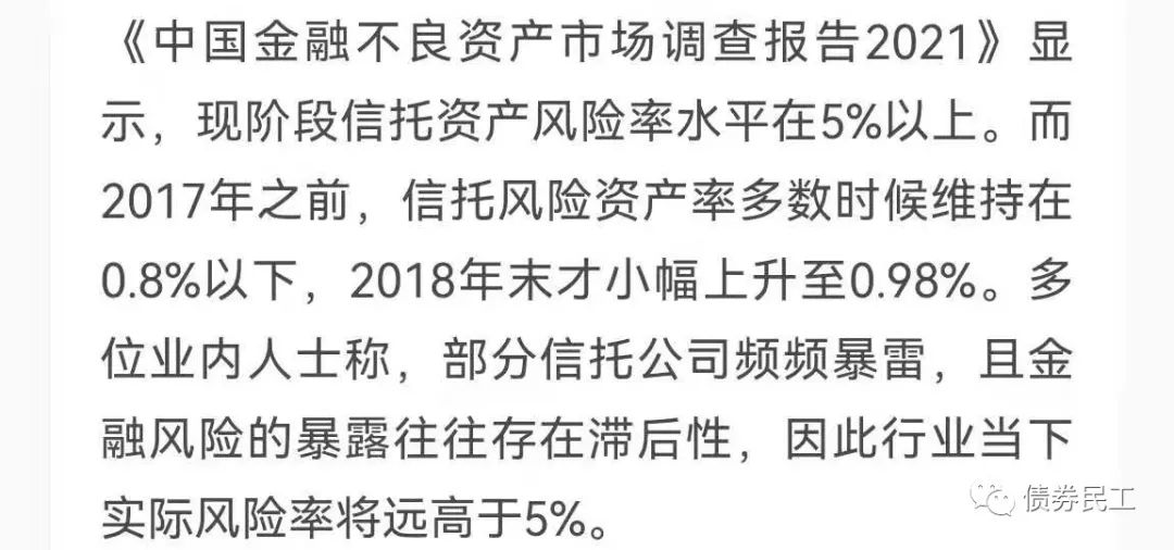 不只是融資類信托產品的規模在下降,信托資產風險率水平也在提高。根據《中國金融不良資產市場調查情況報告》的統計數據,2017年之前信托資產風險率維持在0.8%以內,但是現在信托行業的實際風險率將遠高于5%。