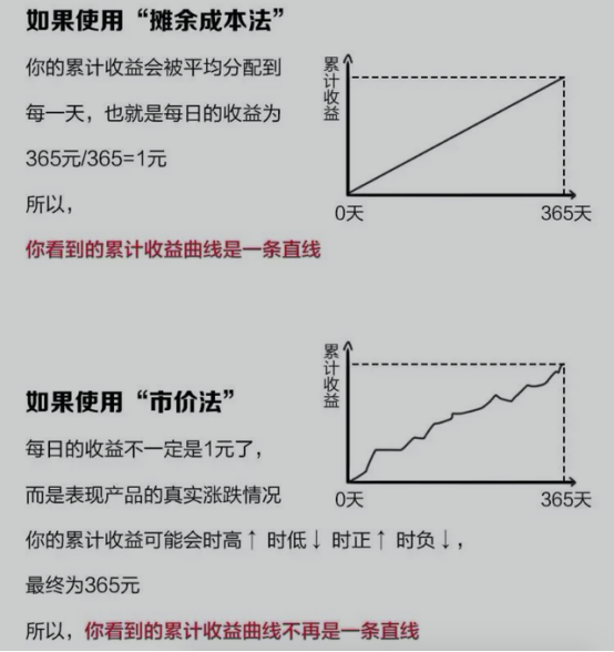 “攤余成本法”,對投資人來說算個過度階段吧,畢竟大家可能一下子接受不了理財產品出現明顯波動,而攤余成本計價的好處就是能抹平波動,投資者看到的每日收益相對穩定一些。