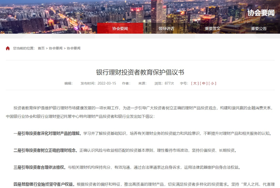 正值“315”,中國銀行業協會官網刊出《銀行理財投資者教育保護倡議書》,協會和銀行業理財登記托管中心特向理財產品投資者和銀行業發出倡議。