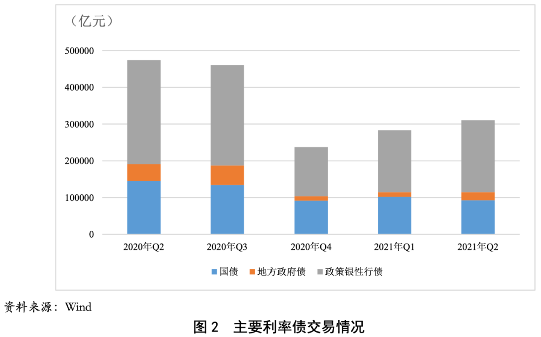 本季度,債券市場共發行利率債3.98萬億元,環比增長19.92%,同比減少29.67%。其中,地方政府債的二季度發行量增幅顯著,可能由于一季度地方債提前批額度下達較晚,二季度地方債額度下達后集中發行,導致發行量環比大幅增長。政策性銀行債的二季度發行量降幅顯著。截至2021年二季度末,我國債券市場利率債品種存量規模達到68.91萬億元,較上季度末繼續增加。