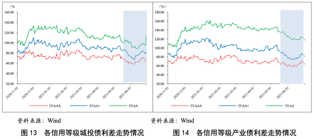 2.城投債和產業債信用利差整體繼續呈波動下行走勢
