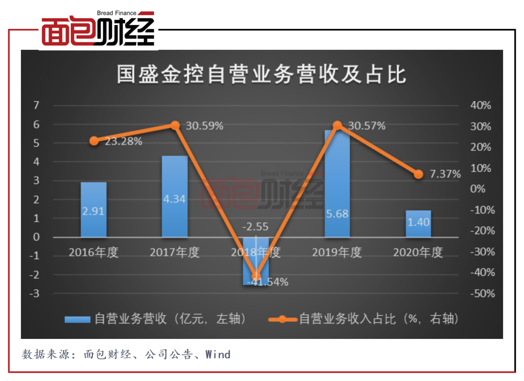 2020年,國盛金控的自營業務規模大幅下降。公司稱報告期間,出于控制風險的考量,降低了自營業務的規模。當期公司證券自營業務收入1.40億元,較2019年減少4.28億元,降幅達75.31%。主要受此影響,期末公司的交易性金融資產為56.06億元,較上年末下降44.77%。