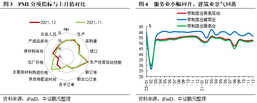 2021年,PMI整體表現(xiàn)較為低迷,指數(shù)上半年好于下半年,最高點(diǎn)是3月份,PMI指數(shù)為51.9%;二季度開始保持下滑趨勢;三季度下行壓力大,其中9月和10月PMI低于50%,處于收縮區(qū)間;隨著保供穩(wěn)價(jià)政策效果顯現(xiàn),四季度逐漸重回?cái)U(kuò)張區(qū)間。12月,PMI指數(shù)錄得50.3%,連續(xù)第二個(gè)月穩(wěn)定在擴(kuò)張區(qū)間。