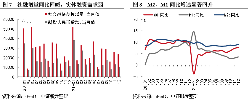 M2、 M1同比增速顯著回升:12月末,廣義貨幣(M2)余額238.29萬億元,同比增長9%,增速比上月末高0.5個(gè)百分點(diǎn),比上年同期低1.1個(gè)百分點(diǎn);狹義貨幣(M1)余額64.74萬億元,同比增長3.5%,增速比上月末高0.5個(gè)百分點(diǎn),比上年同期低5.1個(gè)百分點(diǎn);流通中貨幣(M0)余額9.08萬億元,同比增長7.7%。全年凈投放現(xiàn)金6510億元。