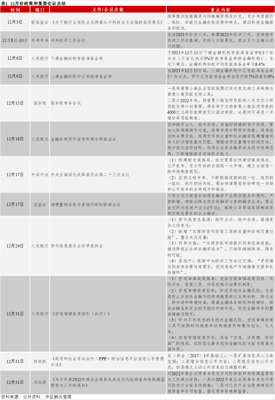 貨幣政策方面:12月份,經(jīng)濟(jì)下行壓力大,央行降準(zhǔn)、降息釋放寬松的信號(hào),寬貨幣+寬信用預(yù)期形成。12月6日,央行決定于2021年12月15日下調(diào)金融機(jī)構(gòu)存款準(zhǔn)備金率0.5個(gè)百分點(diǎn),本次全面降準(zhǔn)已有充分預(yù)期且快速兌現(xiàn),足見貨幣政策的前瞻性和主動(dòng)性。主要目的:一是經(jīng)濟(jì)下行壓力大的共識(shí)前提下,在出口不確定性,新型變異毒株等影響下,經(jīng)濟(jì)增長需要寬信用,寬信用的前提需要寬松的貨幣政策來托底;二是對(duì)沖房地產(chǎn)企業(yè)可能引發(fā)的上下游風(fēng)險(xiǎn),甚至監(jiān)管預(yù)料不到的狀況,即使一行兩會(huì)對(duì)恒大等債務(wù)風(fēng)險(xiǎn)事件的個(gè)案定性,但仍不能打消對(duì)房地產(chǎn)行業(yè)的顧慮和風(fēng)險(xiǎn)預(yù)期,特別是可能產(chǎn)生的爛尾項(xiàng)目、農(nóng)民工工資拖欠、生產(chǎn)安全穩(wěn)定等問題;三是對(duì)沖MLF到期,12月15日有9500億元MLF到期,維持流動(dòng)性的合理充裕。