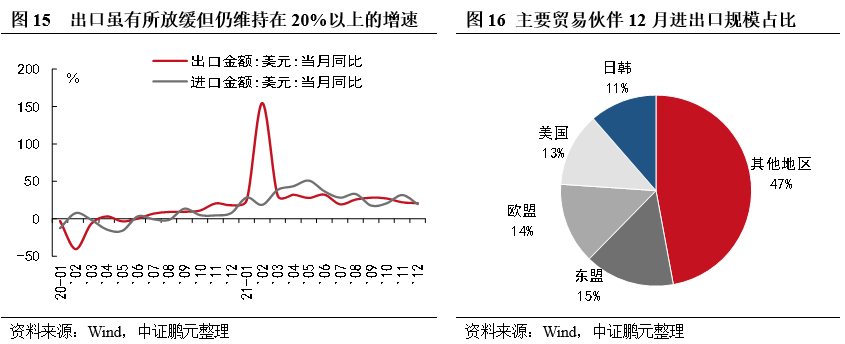 2021年12月,按美元計(jì),出口同比20.9%,前值22.0%;進(jìn)口同比19.5%,前值31.7%;順差944.6億美元,前值717.2億美元,出口仍保持高位增長。12月主要進(jìn)出口國別中,東盟、歐盟、美國分別居前三位,占比15%、14%、13%。