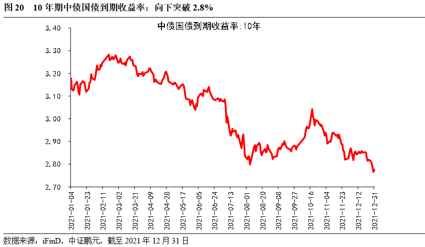 12月9日,央行上調(diào)金融機(jī)構(gòu)外匯存款準(zhǔn)備金率2個(gè)百分點(diǎn),即外匯存款準(zhǔn)備金率由現(xiàn)行的7%提高到9%,主要是為應(yīng)對(duì)人民幣的升值壓力,引導(dǎo)預(yù)期。12月20日,1年期LPR報(bào)價(jià)3.80%,較前值降低5BP,而五年期LPR報(bào)價(jià)4.65%,維持不變,此次非對(duì)稱的降息,旨在降低銀行短期負(fù)債成本,加大對(duì)實(shí)體經(jīng)濟(jì)的支持,五年期LPR掣肘于房地產(chǎn)“房住不炒”的總基調(diào),疊加房地產(chǎn)企業(yè)風(fēng)險(xiǎn)并未出清,需慎之又慎。截至2021年12月31日,10年期國債收益率向下突破此前大多數(shù)人認(rèn)定的低點(diǎn)2.8%,達(dá)到2.78%。