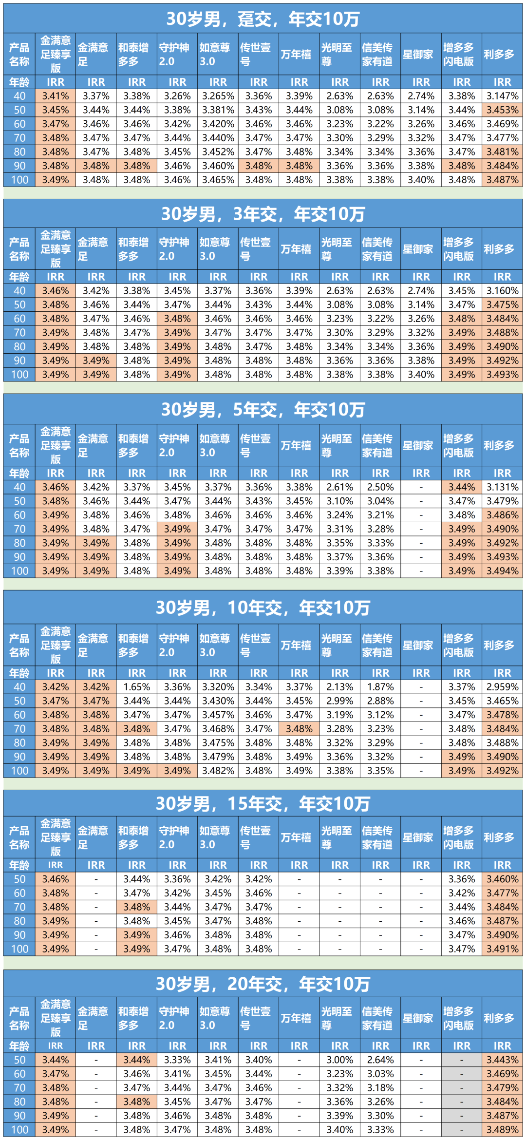 比如增多多增額終身壽險,在躉交、3年交、5年交的時候,各年齡段的收益率雖然很接近最高一檔的金滿意足增額壽險和利多多增額壽險,但總歸差了那么一點點。