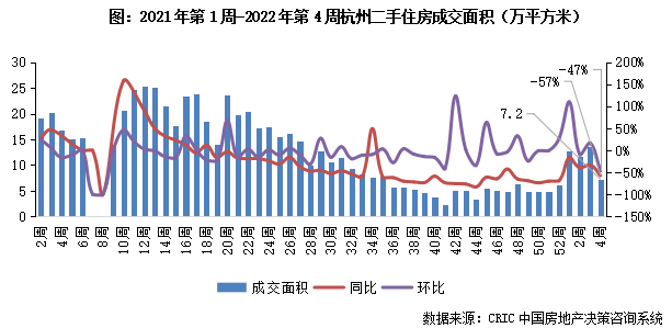 2022年第4周,杭州二手住房環比跌47%至7.2萬平方米,同比跌幅擴大至57%。2021年下半年以來杭州二手房市場持續下行后保持低位震蕩,前三周市場顯著放量回升但本周高位顯著回落,預計大幅震蕩后規模或企穩。