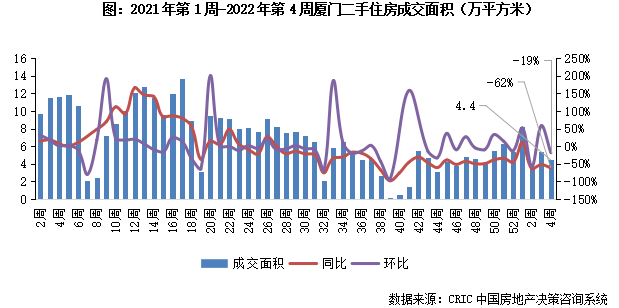 2022年第4周,廈門二手住房成交面積環比下降19%,同比下降62%,成交規模收4.4萬平方米。本周市場再度下行,短期內成交規模難回前期高位。
