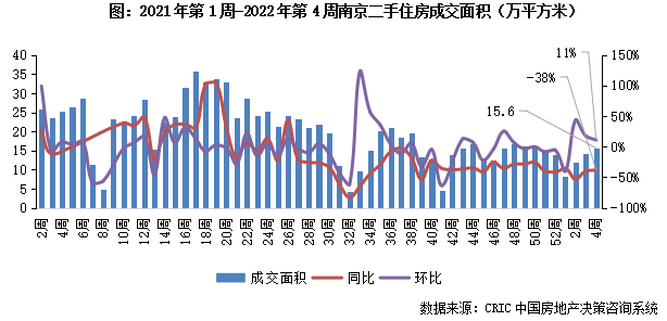 2022年第4周,南京二手住房成交面積收15.6萬平方米,環比較上周回升11%,同比跌幅收窄至38%。本周成交規模“三連漲”且同比跌幅持續收窄,預計后續市場或保持穩中有增。