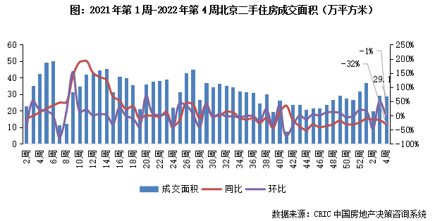 2022年第4周,北京二手房成交面積為29.1萬平方米,環比微跌1%持穩,較去年同期降幅擴大至32%。本周北京二手房市場成交較上周企穩,市場仍處于較高水平,預計短期內市場規模或小幅震蕩。