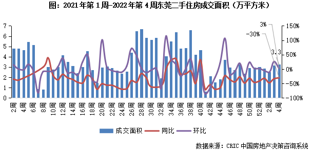 2022年第4周,東莞二手住房成交面積收3.3萬平方米,環比微增3%,同比跌幅收窄至30%。本周成交規模持續小幅回升,市場進入平臺波動期。