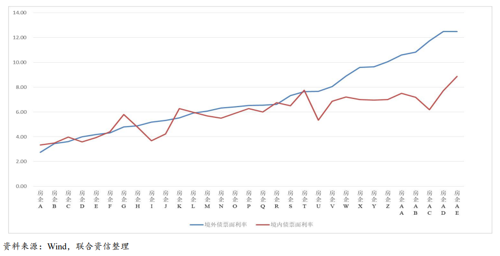 由于部分房地產(chǎn)企業(yè)綜合融資成本難以獲取,我們采用其債券發(fā)行票面利率作為篩選標(biāo)準(zhǔn)。我們以2020年以來,境內(nèi)外市場同時(shí)發(fā)行債券的企業(yè)為研究對象,對其發(fā)行債券的票面利率做簡單的算數(shù)平均進(jìn)行對比。考慮到境外美元債償債資金來源除借新還舊外,實(shí)質(zhì)來自于境內(nèi)公司,因此我們主要選取更能反映公司的真實(shí)信用風(fēng)險(xiǎn)的境外控股公司作為分析標(biāo)的,詳見下圖。