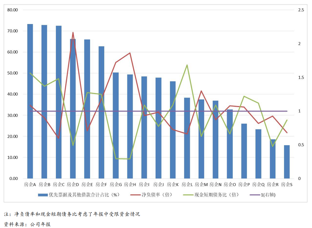 我們認(rèn)為,融資渠道中高成本的優(yōu)先票據(jù)及其他借款(以信托和資管計(jì)劃等非標(biāo)融資為主)合計(jì)占比較高,一定程度上能反映出公司境內(nèi)銀行和公開市場融資難度大。另一方面,美元債發(fā)行及交易影響因素多,二級(jí)市場價(jià)格波動(dòng)可能會(huì)引發(fā)公司提前贖回債券,從而影響公司正常的資金安排;此外,國家相關(guān)政策在收縮非標(biāo)融資規(guī)模,長遠(yuǎn)看房地產(chǎn)企業(yè)非標(biāo)融資難度也將越來越大。因此,優(yōu)先票據(jù)及其他借款占比高,可能預(yù)示著公司的潛在信用風(fēng)險(xiǎn)較大。