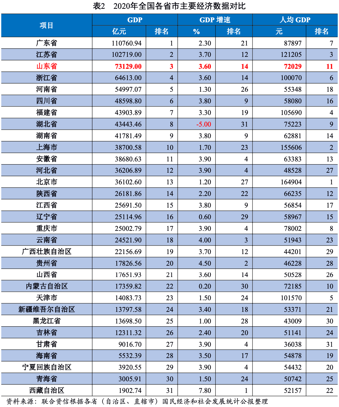 從經濟運行方面看,2018-2020年,山東省經濟實力不斷增強,2020年GDP總量處于全國前列,保持全國第3位,經濟增速受疫情影響有所回落,仍高于全國GDP增速1.30個百分點。2018-2020年,山東省人均GDP逐年提高,與全國GDP水平基本持平,位居全國第11位。