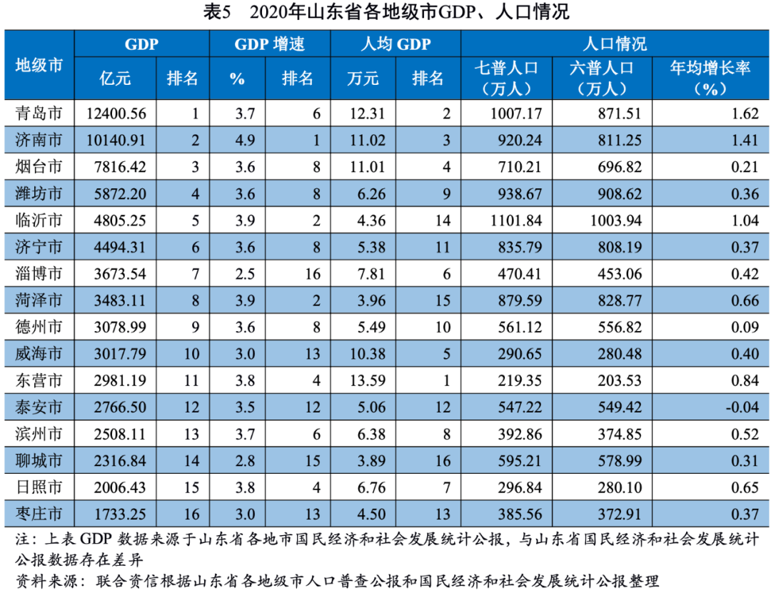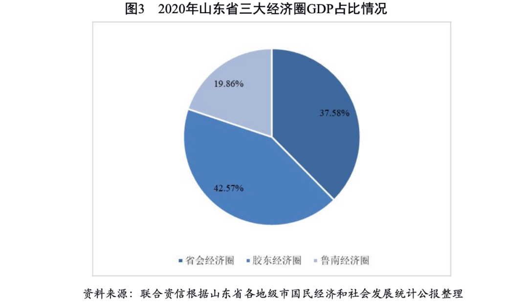山東省形成了省會、膠東和魯南三大經濟圈,其中以青島市、煙臺市等沿海城市為主的膠東經濟圈和以濟南市為主的省會經濟圈的經濟和財政實力較強。2020年,山東省各地級市經濟發展分化程度明顯,青島市和濟南市經濟實力較強,經濟增速較快,人口虹吸效應強。