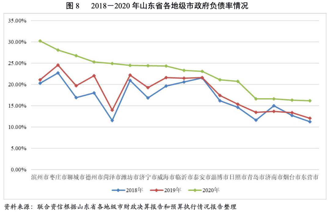 債務負擔方面,2018-2020年,山東省各地級市政府負債率均呈增長態勢。2020年,濱州市政府負債率為省內各地級市中最高(30.21%),較上年末增長9.15個百分點,菏澤市政府負債率增幅最大,為11.01個百分點。2020年,青島市、濟南市、煙臺市和東營市政府負債率低于20%。