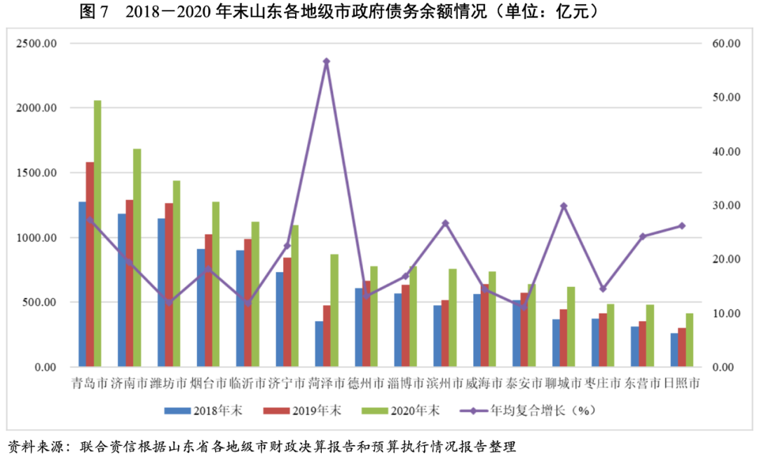 從政府債務層面看,山東省各地級市政府債務規模呈擴張趨勢,2018-2020年末年均復合增長率均超過10%,其中菏澤市政府債務余額增長迅速,年均復合增長率達到56.68%,聊城市、青島市、濱州市和日照市政府債務余額年均復合增長率均超過25.00%。2020年末青島市政府債務余額最大,其次是濟南市、濰坊市、煙臺市、臨沂市和濟寧市,上述6個地級市政府債務余額均在千億以上,其余地級市政府債務規模均在900億元以下,其中日照市的政府債務規模最小,為415.90億元。