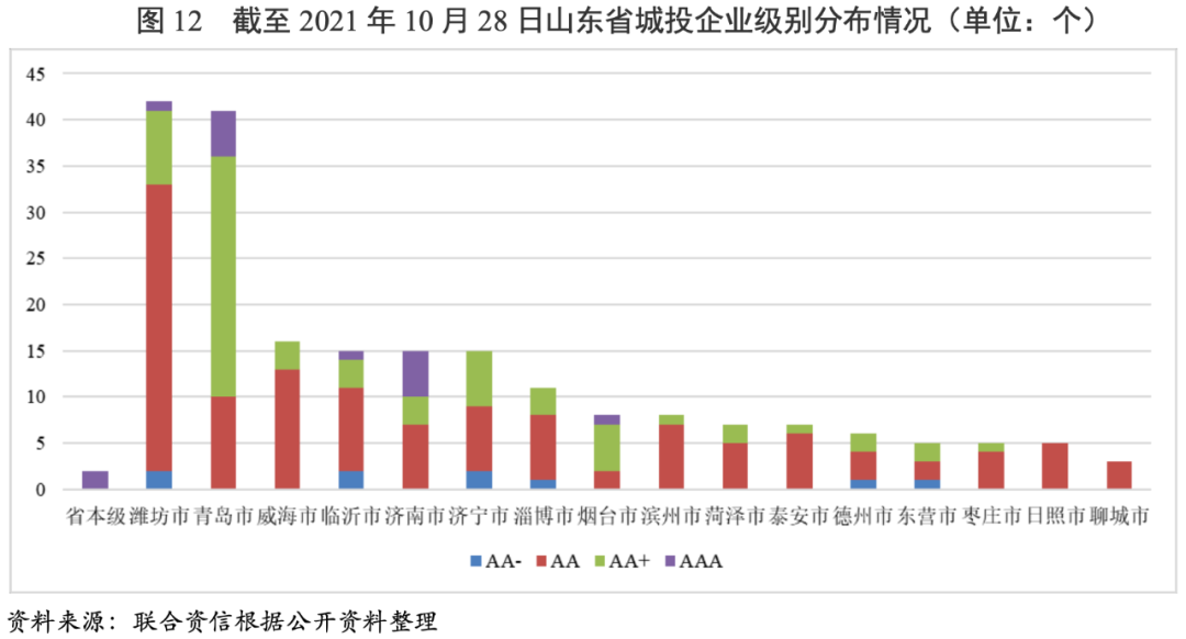 截至2021年10月28日,山東省有存續主體級別的城投企業共211家。其中,省本級城投企業2家,地級市本級城投企業40家,地級市下轄區級及縣級(含縣級市)城投企業129家,園區城投企業40家;主體級別為AAA的城投企業15家,主體級別為AA+的城投企業66家,主體級別為AA的城投企業121家,主體級別為AA-的城投企業9家。分地級市來看,濰坊市的城投企業數量最多,為42家,其次為青島市(41家)、威海市(16家)、臨沂市(15家)、濟南市(15家)、濟寧市(15家)和淄博市(11家),其余地級市城投企業數量相對較少。從級別分布看,AAA城投企業主要集中于省本級及經濟財政實力強的青島市和濟南市,其余地級市中只有煙臺市、臨沂市和濰坊市各有1家AAA城投企業,但上述地級市與青島市和濟南市的經濟和財政實力存在一定的差距。除聊城市和日照市以外,其余地級市均有AA+級別城投企業,聊城市和日照市城投企業最高級別為AA,級別為AA-的城投企業全部位于區縣和園區。