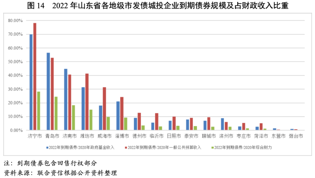 從城投企業2022年到期債券規模占2020年一般公共預算收入或政府性基金收入的比重來衡量一般公共預算收入或政府性基金收入對到期債券的覆蓋情況,償債壓力較大的城市為濟寧市、青島市、濟南市和濰坊市;以2020年綜合財力對城投企業2022年到期債券覆蓋程度來衡量2022年城投債券的到期償還壓力,2022年到期債券占2020年綜合財力比重較高的城市仍然為濟寧市、青島市、濟南市和濰坊市,占比分別為28.22%、24.18%、18.18%和16.72%。總體看,濟寧市、青島市、濟南市、濰坊市和威海市城投企業到期債券的集中償付壓力較大。
