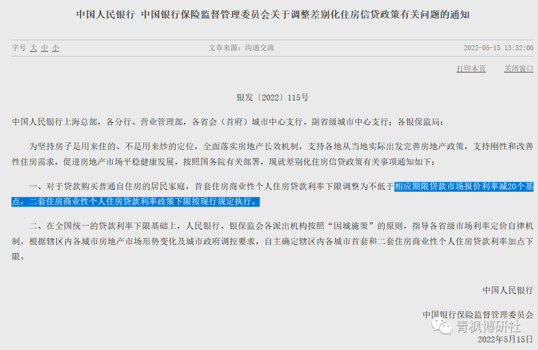 (一)2022年5月15日,央行和銀保監(jiān)會(huì)聯(lián)合發(fā)布《關(guān)于調(diào)整差別化住房首套住房信貸政策有關(guān)問題的通知》(銀發(fā)(2022)115號(hào)),明確首套住房貸款利率下限調(diào)整為LPR-20BP,二套房貸款利率下限按現(xiàn)行規(guī)定執(zhí)行。