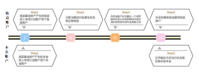 需要說明的是,在消費金融類ABS的專項計劃賬戶一般不區分本金賬戶和收益賬戶。與對公信貸ABS和對公融資租賃ABS不同,消費金融類ABS基礎資產的回款頻率高,回款分布較為均勻,一般不會出現某個期間內基礎資產回款金額過少而導致不足以支付證券收益的情況。