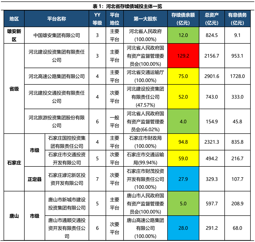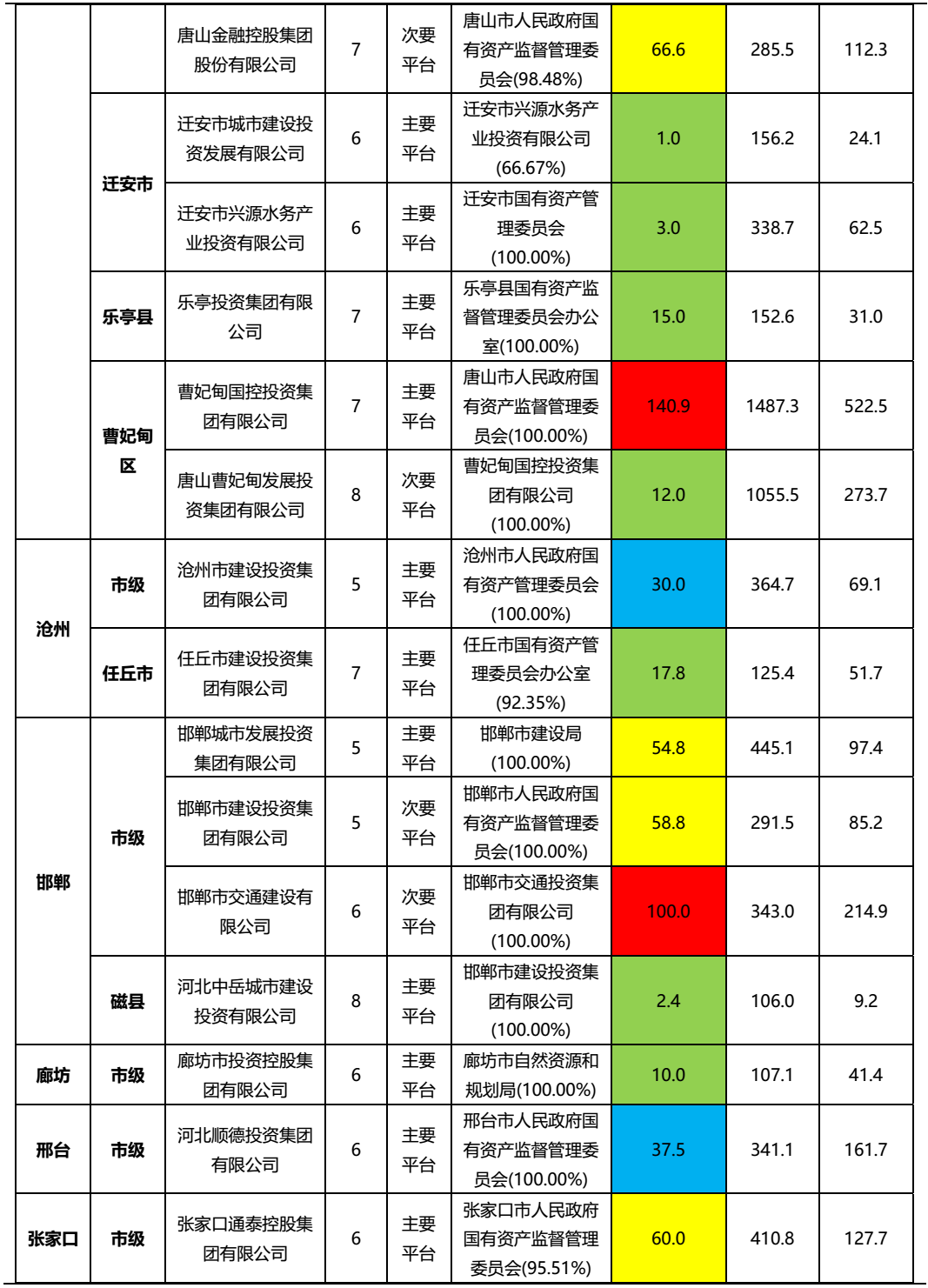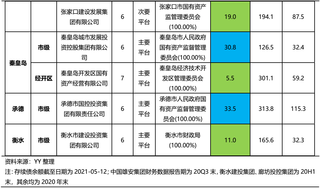 分地區深入來看,省級平臺4家,另有一家位于雄安新區的中國雄安集團。其中,雄安集團是雄安新區內土地開發、基建、城市運營等業務主體,目前雄安集團正處于高速發展階段,信用資質很強。其余省級平臺中,河北建投(省內最大國有資產運營平臺,能源、水務方面優勢顯著)、河北高速(負責養護管理的高速通車里程占河北省總里程約一半)以及河北交投(省內鐵路建設投資方面具有壟斷性優勢)在省內地位重要,整體信用資質較好,安全邊際相對較高;河北旅投(主要經營旅游及住宅開發)則在規模、重要性等方面相對邊緣,整體資質明顯弱于其他三家。