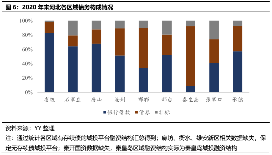 第三梯隊的邢臺、秦皇島、張家口、衡水和承德市域經濟偏弱,各有1-2家存續債平臺,業務及資源較為集中,YY評級均在6附近。除承德、衡水(相關信息缺失)外,其余三市融資結構均有隱憂,邢臺、張家口非標融資占比偏高,分別約為19.4%、26.1%;秦皇島平臺融資則過于依賴債券(約83%),公開市場債務續作壓力很大。