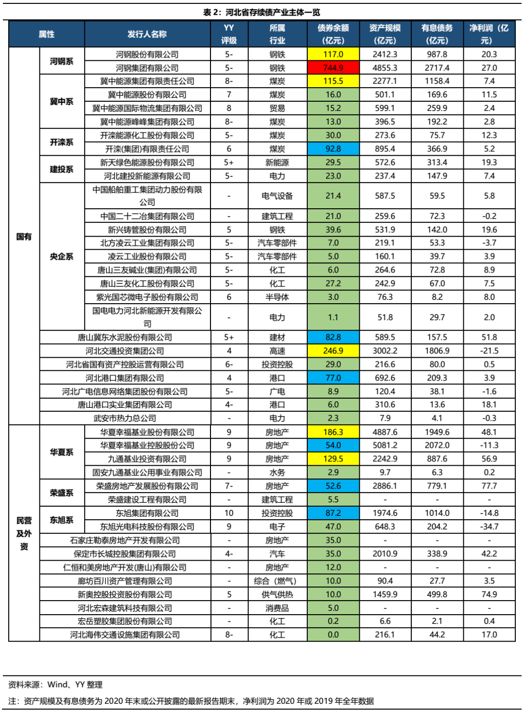 河北省產業主體資質水平均一般,YY評級最高的河北交通投資集團公司(評級4),其余多集中在5-6附近,而冀中能源、華夏幸福則滑入8-9的深淵。歷經東旭、華夏幸福相繼違約,本就不多的河北省民營產業主體基本已宣告信用破產;原本相對可靠的國有產業主體也因為冀中能源而受到不同程度的波及,實際上,河北的產業發債主體應以區域一盤棋的視角來看。