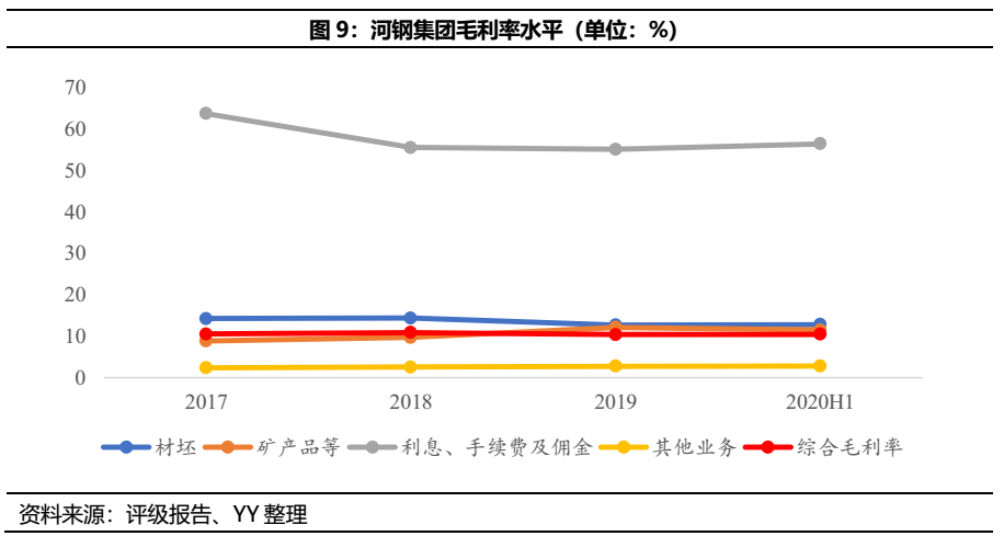鋼鐵業務方面,河鋼的粗鋼產量國內第二、世界第四,主要銷售區域為包括京津在內的華北地區(占比近80%)。需求端來看,受益于河鋼完整的產品序列(除無縫鋼管外所有品類全覆蓋),應用范圍廣泛,且雄安新區進入實質建設期,對需求也會起到一定程度的支撐作用;成本端來看,雖然人員負擔較重,但鐵礦和煤礦均在本地及周邊地區有大量存儲(河北有全國最豐富的鐵礦石儲量、山西是傳統的煤炭資源大省),供給充足且運輸半徑短,根據YY的測算結果(粗鋼單噸成本約2,900元),綜合成本控制還是處于行業較優水平。鋼鐵業務供需兩端的平穩給河鋼帶來了一定的安全邊際。非鋼業務方面,則主要包括礦山資源、鋼鐵貿易、化工及金融證券等,整體規模較大但毛利率偏低,一定程度上稀釋了集團的綜合毛利率。