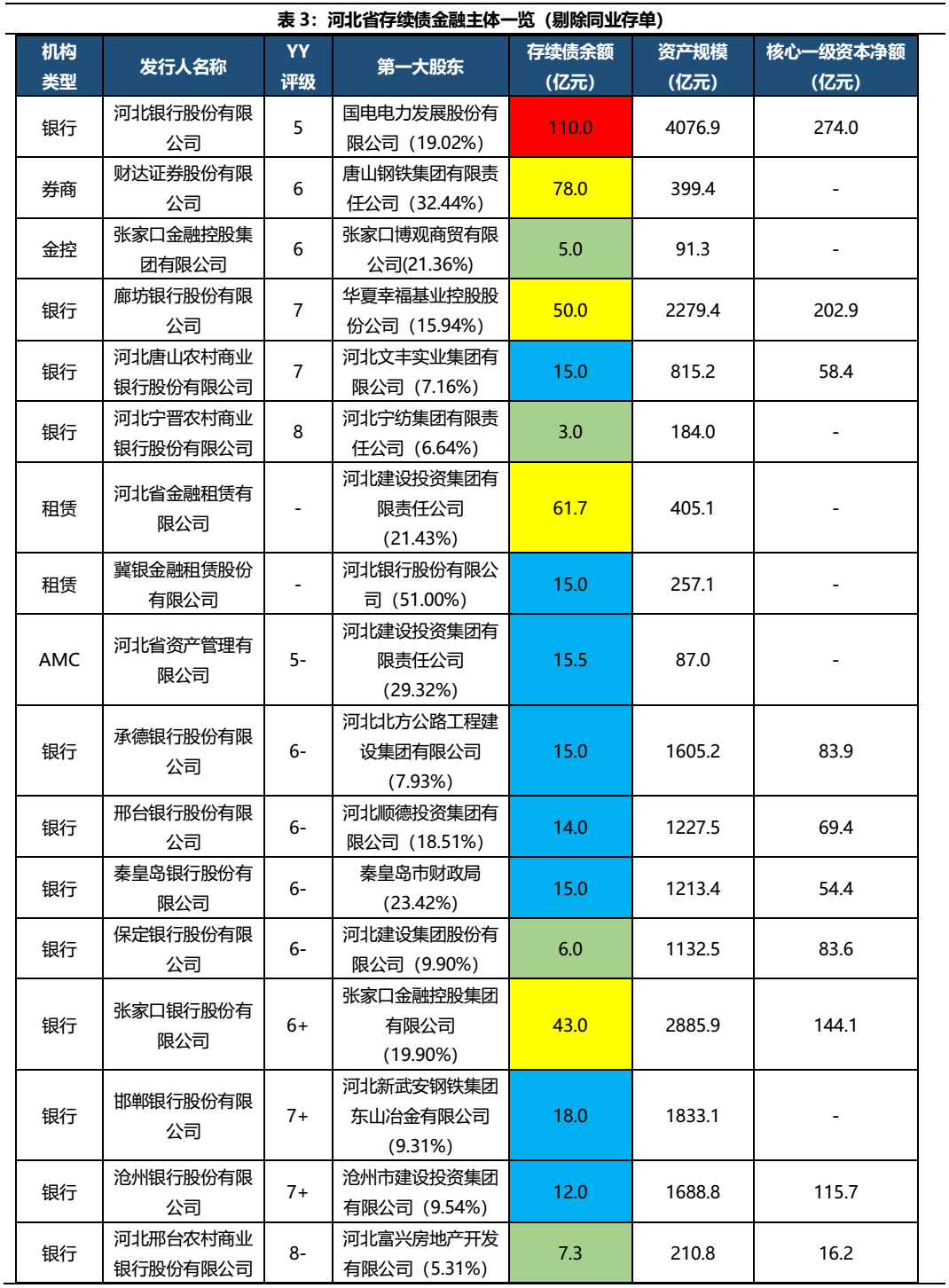 河北省內金融資源相對薄弱,雖然銀行特別是城商行數量較多,但戶均規模都不大。從目前有存續債的金融主體來看,構成包括9家城商行、4家農商行、1家券商、1家AMC、1家金控以及2家租賃公司,整體資質一般。除農商行外,河北省的金融主體仍然呈現出較為濃重的國資背景,第一大股東是民企的僅有邯鄲銀行、廊坊銀行(兩家銀行的第一大股東一個失信被執行,一個債券違約)。