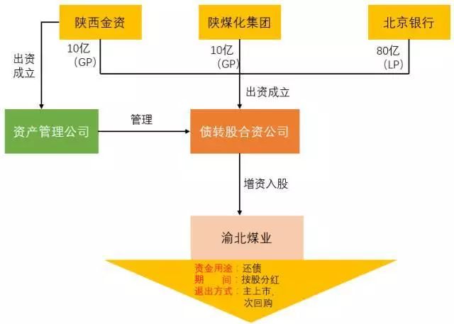 2016年底,陜西金資、陜煤化和北京銀行協(xié)議分別出資10億、10億和80億成立債轉(zhuǎn)股合資公司,合資公司100億元債轉(zhuǎn)股資金對陜煤化全資子公司陜西陜煤榆北煤業(yè)有限公司(以下簡稱“榆北煤業(yè)”)進行注資,完成債轉(zhuǎn)股。