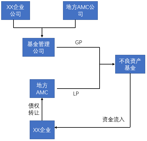 由資金周轉(zhuǎn)困難的公司和資產(chǎn)管理公司合資成立的一般合伙人(GP),與資產(chǎn)管理公司共同組建不良資產(chǎn)處置基金,基金以籌集的資金向陷入困境的公司發(fā)放1億元借款,專項用于其到期部分債務(wù)的替換和轉(zhuǎn)貸,以及生產(chǎn)流動性資金支出。