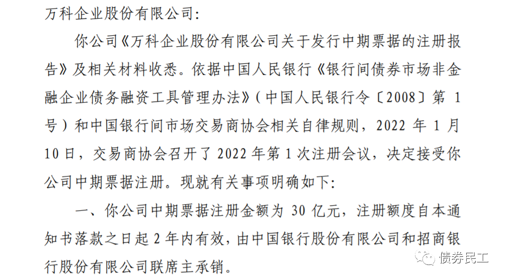 1、萬科企業股份有限公司共取得3只中期票據批文,合計中期票據批文金額為80億元。萬科公司本次中期票據批文的公布日期是2022年3月4日,注冊會議的時間為2022年1月10日(第1次注冊會議),落款日為2022年1月13日。