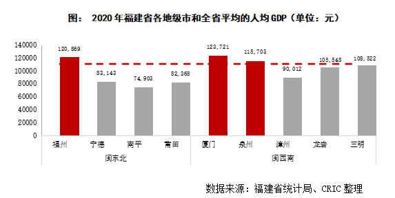 目前階段,閩西南的經濟活力強于閩東北。從經濟體量來看,2020年閩西南單城GDP約5332.4億元,而閩東北單城GDP約3820.8億元。于此同時,同時期,省內經濟體量排名前5的城市分別是泉州、福州、廈門、漳州和龍巖,除福州外其余4個均是閩西南城市,而排名后3位的莆田、寧德和南平都來自閩東北。
