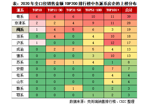 2020年合計19家閩系房企入圍克而瑞TOP200全口徑金額排行榜,與2017年排行榜基本持平,閩系房企上榜數量在所有派系房企中排名第3,僅次于粵系和京津系。主要原因在于福建經濟體量處全國上游,人口流動活躍,本省房地產市場較大,能誕生一定數量的規(guī)模房企。疊加福建人普遍具備較強海洋性民族特點,富有較強的冒險精神和商業(yè)意識,愛拼才會贏能體現其進取心態(tài),相較于其余派系房企,閩系更具膽識,在過去一輪房地產高增長周期里敢于加足杠桿,重倉一二線城市,以此獲得可觀的市場份額。