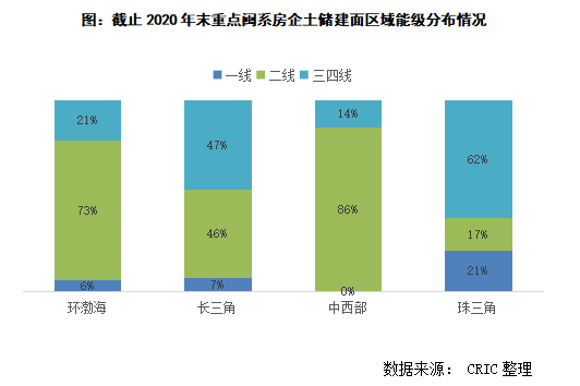 從各個區(qū)域的城市能級分布來看,中西部和環(huán)渤海一二線城市占比較高,長三角相對較為平均,而珠三角則是三四線占比最高。中西部城市的一二線城市占比達到86%,占比最高,且土儲量達到7000萬方以上,是長三角區(qū)域二線城市的1.8倍;環(huán)渤海區(qū)域一二線城市占比達到79%,天津、沈陽、太原是占比最高的三個城市,貢獻環(huán)渤海區(qū)域土儲的50%;而長三角區(qū)域分布相對比較均勻,杭州、蘇州、南京為貢獻最高的三個城市,合計占比32%,三四線城市中,紹興、無錫、徐州貢獻最高,合計占比15%,所以長三角區(qū)域內三四線城市雖然占比較高,但城市集中度相對小于一二線城市;而剔除福建省的珠三角區(qū)域中,佛山、廣州、珠海市貢獻最高的三個城市。