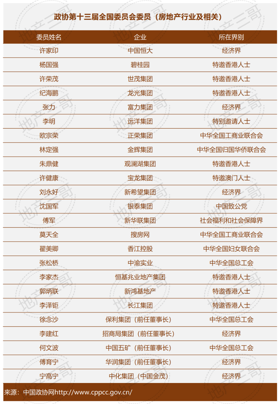 幾位央企背景的房地產(chǎn)企業(yè):如保利發(fā)展、華潤(rùn)置地、招商蛇口,都是控股的央企集團(tuán)層面的負(fù)責(zé)人擔(dān)任全國(guó)政協(xié)委員。遠(yuǎn)洋集團(tuán)的李明先生也是全國(guó)政協(xié)委員,所在界別為特別邀請(qǐng)人士。