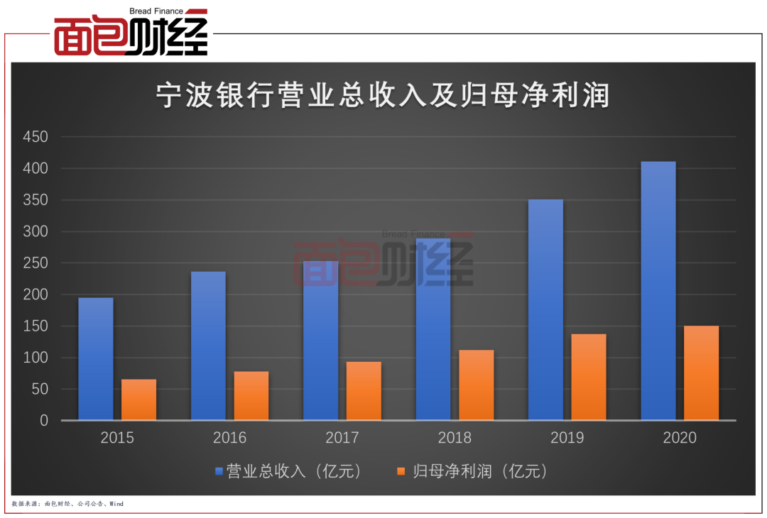 2020年,寧波銀行實現營業收入411.11億元,同比增加60.29億元,增幅為17.19%;實現歸母凈利潤150.50億元,同比增加13.36億元,增幅為9.73%。
