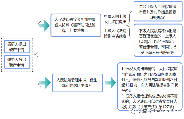 根據《破產法解釋(一)》第7條、第9條和《企業破產法》第10條的規定,人民法院收到破產申請時,應當向申請人出具收到申請及所附證據的書面憑證,人民法院收到破產申請后應當及時對申請人的主體資格、債務人的主體資格和破產原因,以及有關材料和證據等進行審查,并依據破產企業法第10條的規定作出是否受理,人民法院認為申請人應當補充、補正相關材料的,應當自收到破申請之日起五日告知申請人。當事人補充、補正相關材料的期限不計入期限。如果申請人向人民法院提出破產申請,人民法院未接收到期申請,或者未按照《破產法司法解釋(一)》第七條規定執行的,申請人可以向上一級人民法院提出破產申請,上一級人民法院接到破產申請后,應當責令下級人民法院依法審查并及時作出是否受理的裁定,下級人民法院仍不作出是否受理裁定的,上一級人民法院可以徑行作出裁定,上一級人民法院裁定受理破產申請的,可以同時指令下級人民法院審理該案件。