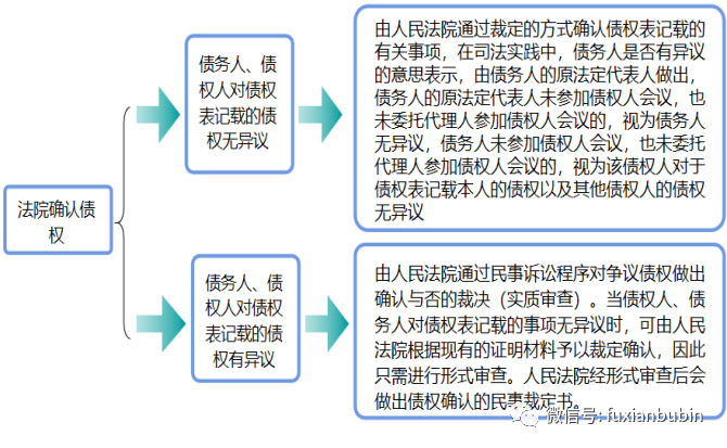 根據《企業破產法》第58條,《破產法司法解釋(三)》規定,法院確認債權的工作主要集中在如下幾個方面:一是債務人、債權人對債權表記載的債權無異議時,由人民法院通過裁定的方式確認債權表記載的有關事項;二是已經生效法律文書確定的債權,管理人應當予以確認。管理人認為債權人據以申報債權的生效法律文書確定的債權錯誤,或者有證據證明債權人與債務人惡意通過訴訟、仲裁或者公證機關賦予強制執行力公證文書的形式虛構債權債務的,應當依法通過審判監督程序向作出該判決、裁定、調解書的人民法院或者上一級人民法院申請撤銷生效法律文書,或者向受理破產申請的人民法院申請撤銷或者不予執行仲裁裁決、不予執行公證債權文書后,重新確定債權;三是在債務人、債權人對債權表記載的債權有異議時,由人民法院通過民事訴訟程序對爭議債權做出確認與否的裁決(實質審查)。當債權人、債務人對債權表記載的事項無異議時,可由人民法院根據現有的證明材料予以裁定確認,因此只需進行形式審查。