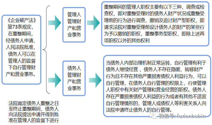根據《企業破產法》第42條、73條、75條、76條、77條;《司法解釋(三)》第2條、5條、15條;參照北京市高級人民法院《企業破產案件審理規程》第205條規定,破產重整期間相關權利主要集中在如下幾項:一是重整期間經營管理權限回歸。經債務人申請,人們法院批準,債務人可以在管理人監督下自行管理財產和營業事務;管理人經申請后應移交所管理的財產和營業事務。