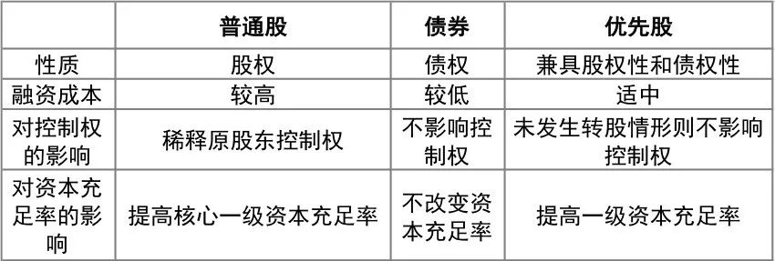 從融資成本角度,普通股發行一般需要較為繁瑣的審核程序,發行成本較高;債券的發行較為簡易,成本較低;優先股介于二者之間。從控制權角度,優先股不會稀釋原股東股權比例。從資本指標角度,債券不能提高銀行的資本充足率,而普通股和優先股均有此功能。若銀行以提高資本充足率為目標發行融資工具且保持原股東控制權不發生重大改變,優先股是相對合適的融資工具,既能滿足監管要求,還能解決再融資問題。