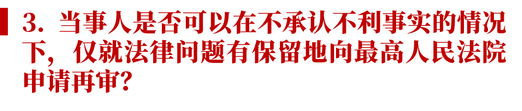 按照這樣的思路,可以主張《審級(jí)改革試點(diǎn)辦法》第十一條的“無(wú)異議”指的是“不提出異議”,是在目前的再審審查階段中不就主要事實(shí)問(wèn)題提出異議,僅要求最高人民法院處理法律問(wèn)題,不排除其后續(xù)在其他程序中提出異議的權(quán)利;或者,此處的無(wú)異議是指與向最高人民法院申請(qǐng)?jiān)賹彽姆蓡?wèn)題相關(guān)的事實(shí)問(wèn)題無(wú)異議,而非對(duì)全案的事實(shí)問(wèn)題均無(wú)異議。