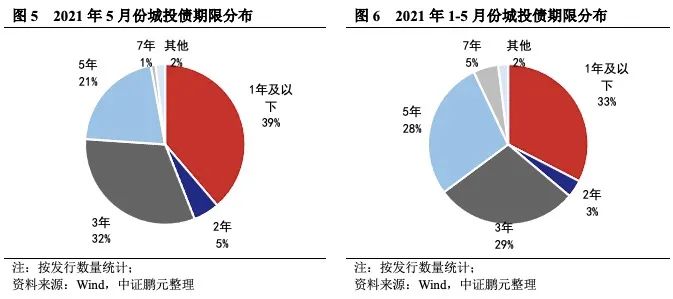 5月份城投債平均發(fā)行期限為2.78年,較4月份的3.64年縮短24%。發(fā)行期限縮短說明債券市場偏謹(jǐn)慎,風(fēng)險(xiǎn)偏好減弱。就發(fā)行數(shù)量來看,5月份發(fā)行的城投債中,3年期城投債發(fā)行67只,占比32%,發(fā)行規(guī)模462.04億元,占比31%;5年期城投債發(fā)行44只,占比21%,發(fā)行規(guī)模354.20億元,占比23%;一年以內(nèi)短期限期品種發(fā)行81只,發(fā)行規(guī)模580.20億元,占比分別為39%、38%。綜合1-5月情況來看,3年期、5年期和一年以內(nèi)城投債發(fā)行數(shù)量占比分別為29%、28%、33%,發(fā)行規(guī)模占比分別為27%、31%、31%。