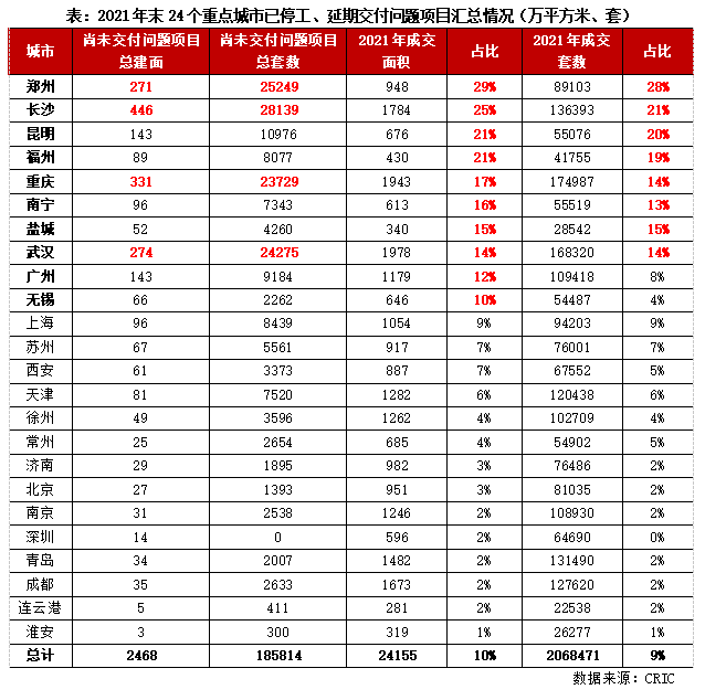 據(jù)CRIC不完全統(tǒng)計數(shù)據(jù)顯示,截至2021年末,24個重點監(jiān)測城市尚未交付的問題項目總建面約2468萬平方米,占2021年商品住宅成交總面積比重達(dá)到10%。其中,鄭州、長沙、重慶和武漢等項目交付風(fēng)險較大,尚未交付的問題項目總建面皆超200萬平方米、總套數(shù)皆超2萬套。例如鄭州,截至2021年末,尚未交付的問題項目總建面約271萬平方米,占成交面積比重高達(dá)29%。又如長沙,尚未交付的問題項目總建面高達(dá)446萬平方米,占比同樣達(dá)到25%。